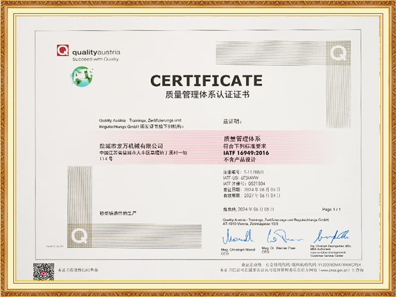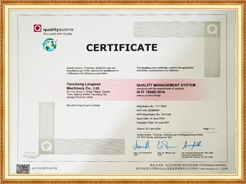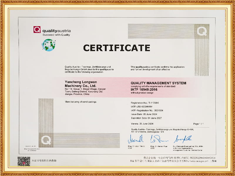 Longwan Machinery possède une variété d'équipements de moulage nationaux et étrangers avancés, y compris 2 lignes de production entièrement automatiques pour le sable d'argile, 1 ligne de production semi-automatique pour le sable d'argile et 1 ligne de production de sable en revêtement, avec une capacité de production annuelle de 15 000 tonnes.